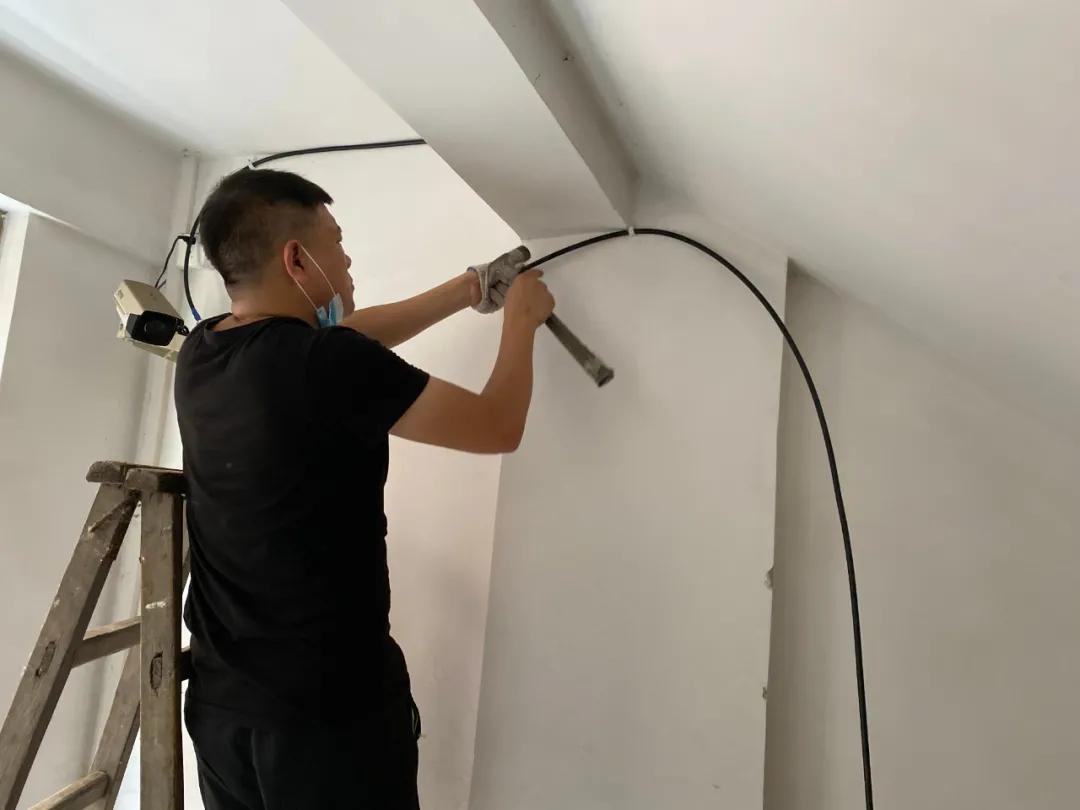 2.把饋線沿著墻壁固定,一直走到樓梯口的天花板,固定吸頂天線;